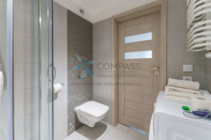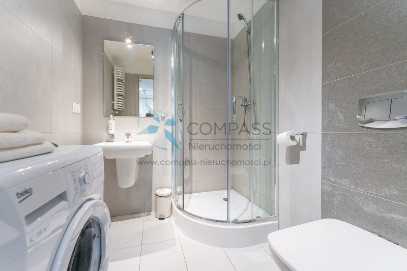 W każdym apartamencie jest nowoczesna łazienka z wygodną kabiną prysznicową (w 1 apartamencie jest wanna) , umywalką i WC a w każdej łazience jest pralka.